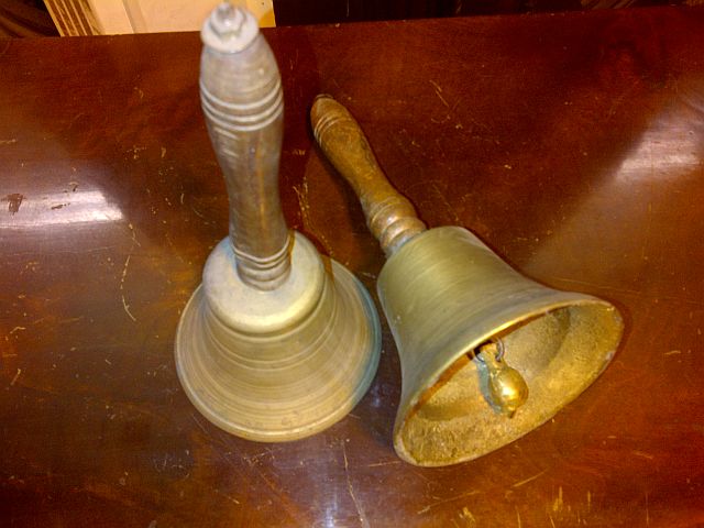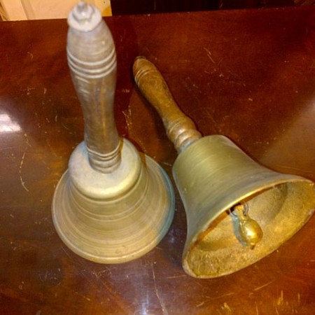 Pair of Antique cast brass hand bell with turned hardwood handle, heavy weight. Circa Mid 19th century.