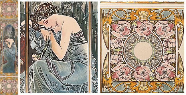 To complement our Art Deco fireplaces, we have selected three such portraits and recreated them as ceramic tile panels. The tile panels are available with matching floral tiles at the top and bottom, the latter also being available singly.