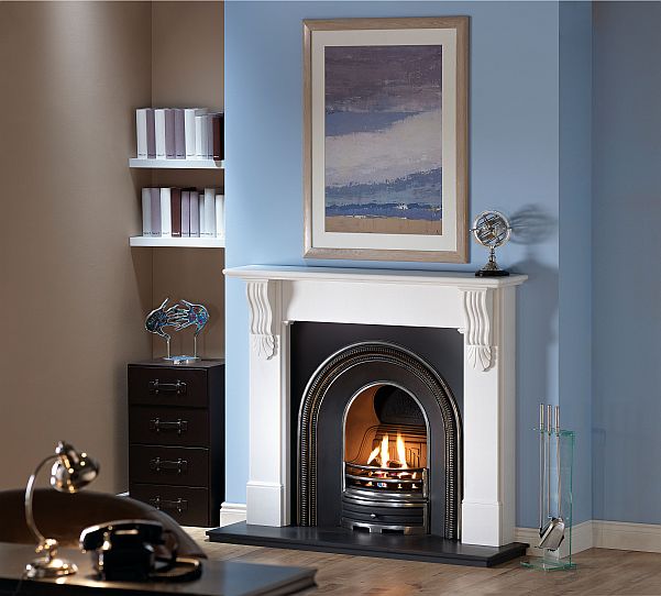 The Sandringham 54″ marble fireplace in Liberty White Marble