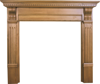 The Corbel is a fine wood fireplace surround in the Georgian style. Corbels separate columns with three vertical curved indentations from a repeated-square pattern that stretches beneath the broad mantel.