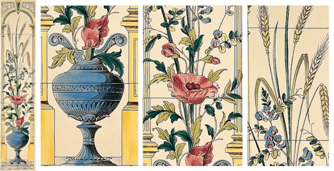 Set against a rich cream glaze, the decoration uses up to 18 separate colours in each design to make the tiles indistinguishable from hand-coloured originals.